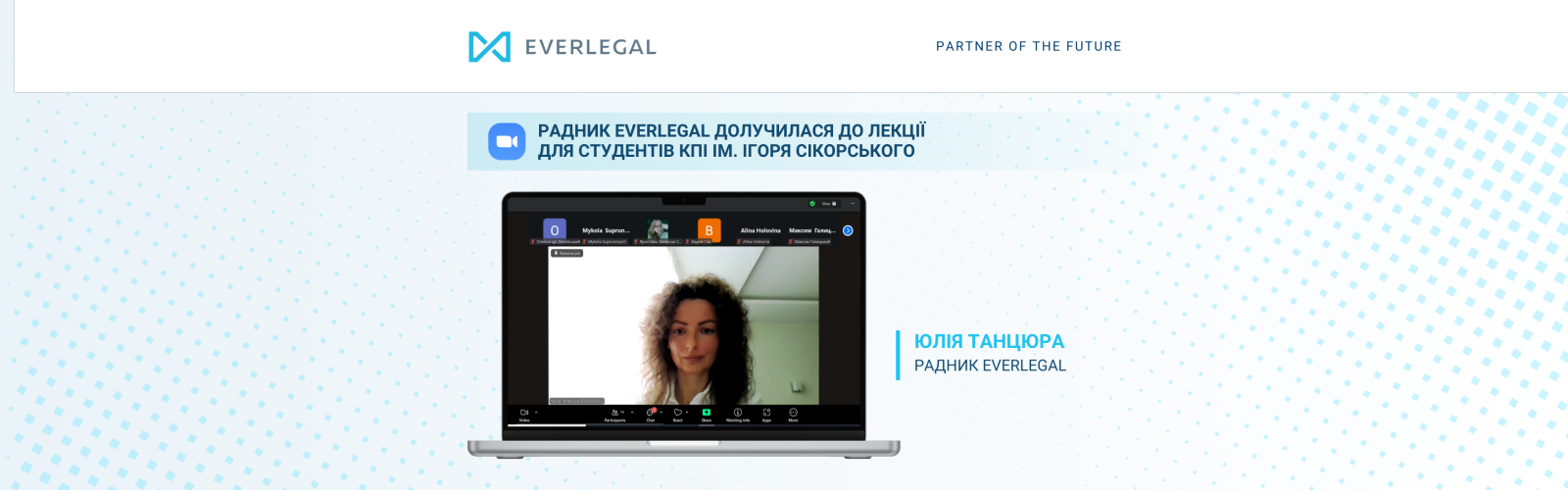 EVERLEGAL Counsel Yuliia Tantsiura, at the invitation of lecturer and Doctor of Philosophy in the field of law (PhD) Viacheslav Shtanko, delivered a guest lecture for students of the Department of Information, Commercial and Administrative Law at Igor Sikorsky Kyiv Polytechnic Institute.